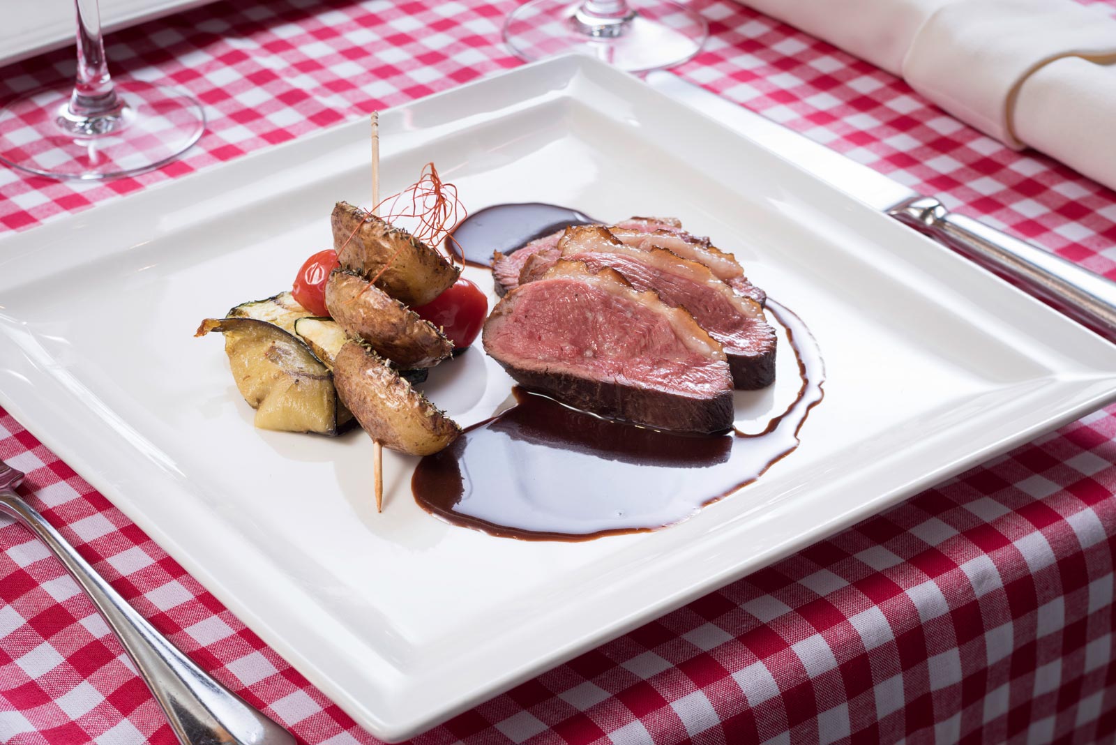 Trancher les légumes et assaisonner avec un peu d'huile d'olive, des herbes du jardin, du sel et du poivre. Faire bouillir les pommes de terre nouvelles dans de l'eau salée pendant 5 minutes, les retirer et les laisser refroidir. Coupez les pommes de terre en deux et mélangez-les aux légumes marinés, qui sont maintenant prêts à griller. Préparez le magret de canard en enlevant un peu de gras sur les côtés et en incisant le gras sur le dos. Assaisonner de sel et de poivre et cuire sur la plaque chauffante, côté gras vers le bas en premier. Utilisez un thermomètre à cœur (57 degrés).