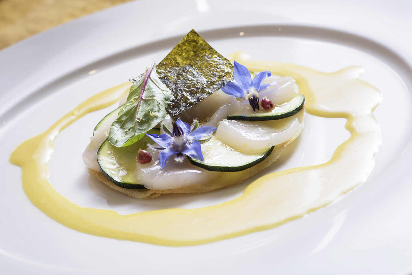 Déposer les Saint-Jacques et les courgettes finement hachées sur le fond croustillant. Badigeonner d'huile d'olive et saupoudrer de zeste de citron râpé et de gros sel marin.