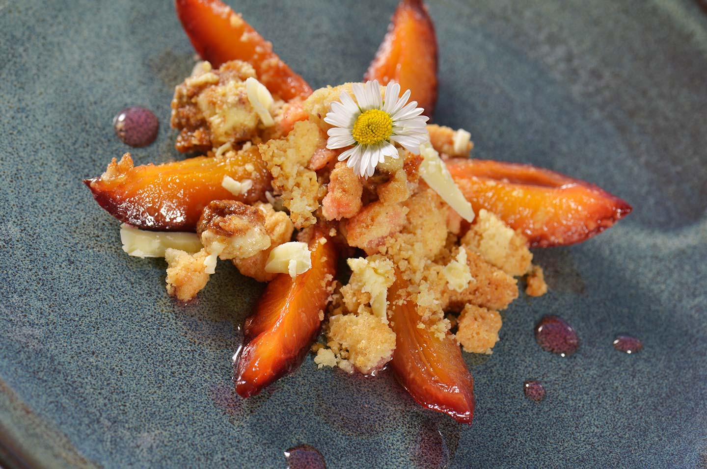 Faire fondre le beurre et ajouter les prunes. Ajoutez maintenant la gousse de vanille grattée, une pincée de sel et le porto et laissez mijoter. Retirer ensuite du gril et réserver.