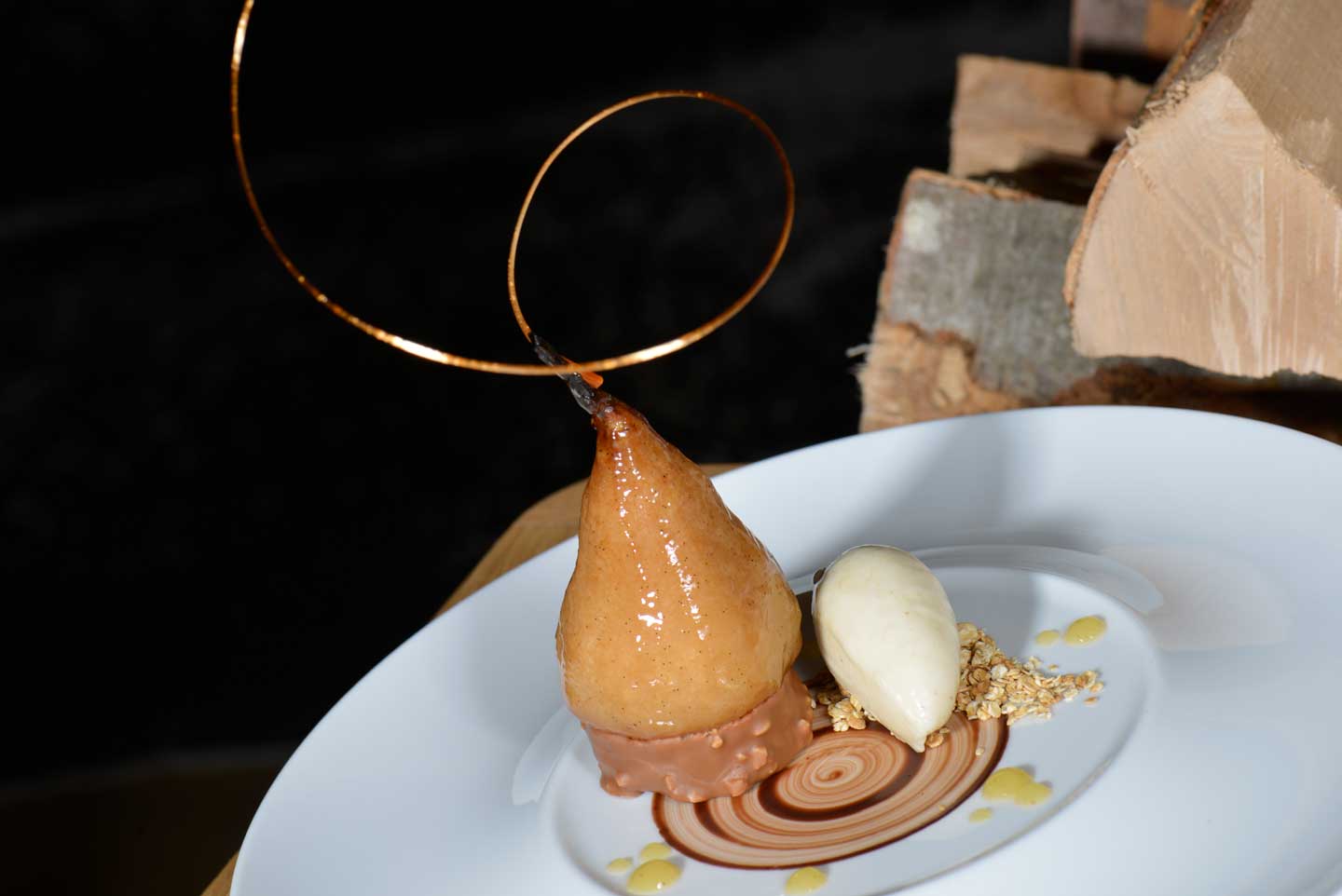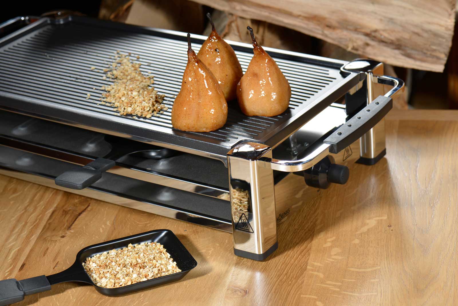 Die Birne schälen, halbieren und entkernen. Zusammen mit der Butter, Zucker und der Vanilleschote auf dem Tischgrill garen.