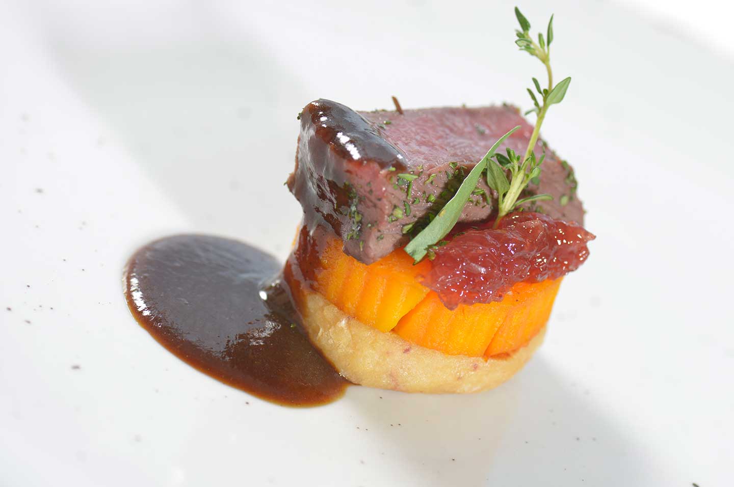 In der Folie geschmorter Butternusskürbis mit Gewürz Rehrücken und Kartoffel-Preiselbeertaler