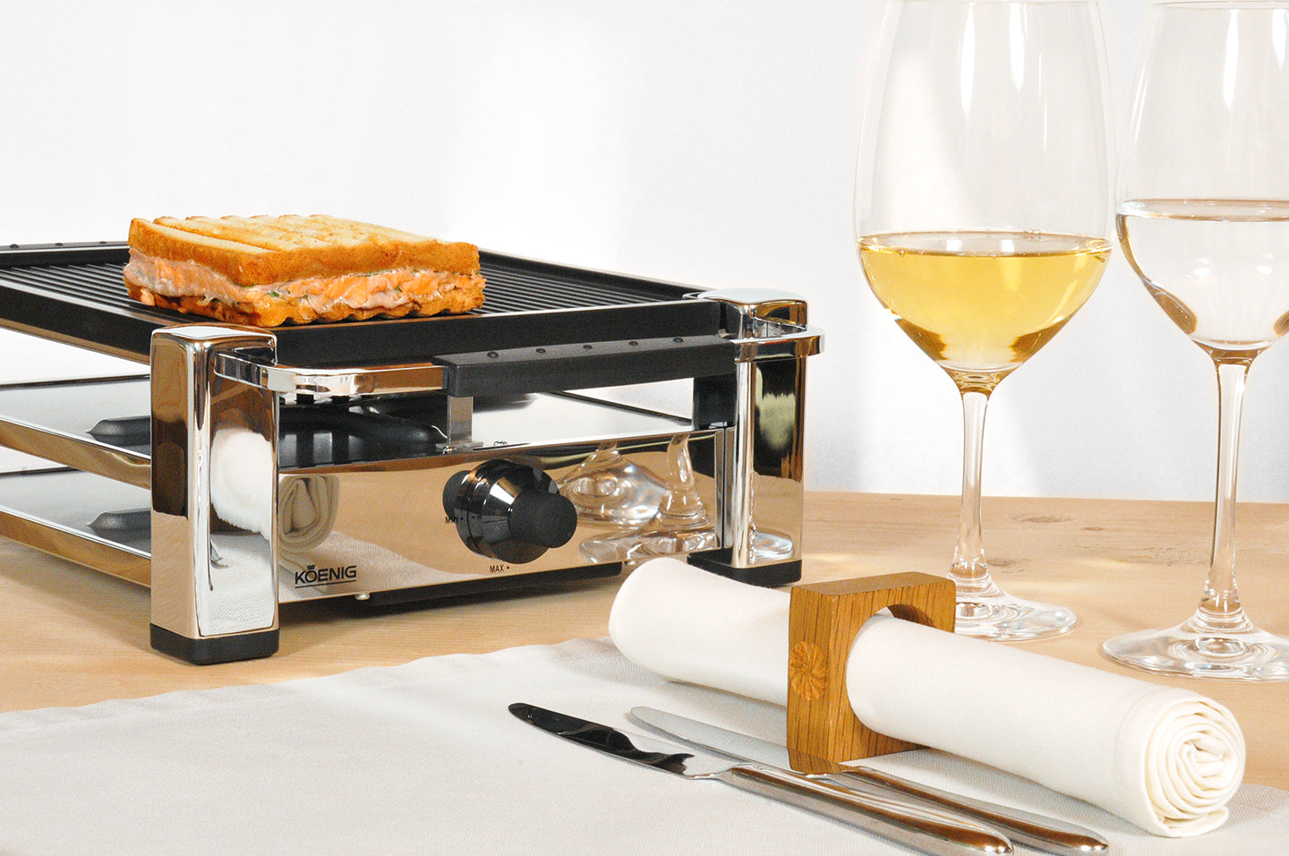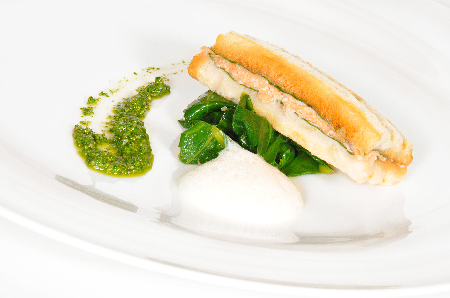 Die Saiblingfilet ohne Haut und Gräten dünn aufschneiden und auf 4 bestrichene Toastscheiben verteilen, mit 8 blanchierten Mangoldblättern belegen und zusammenklappen. Mit dem KOENIG Sandwichgrill Paninoteca am Tisch garen.