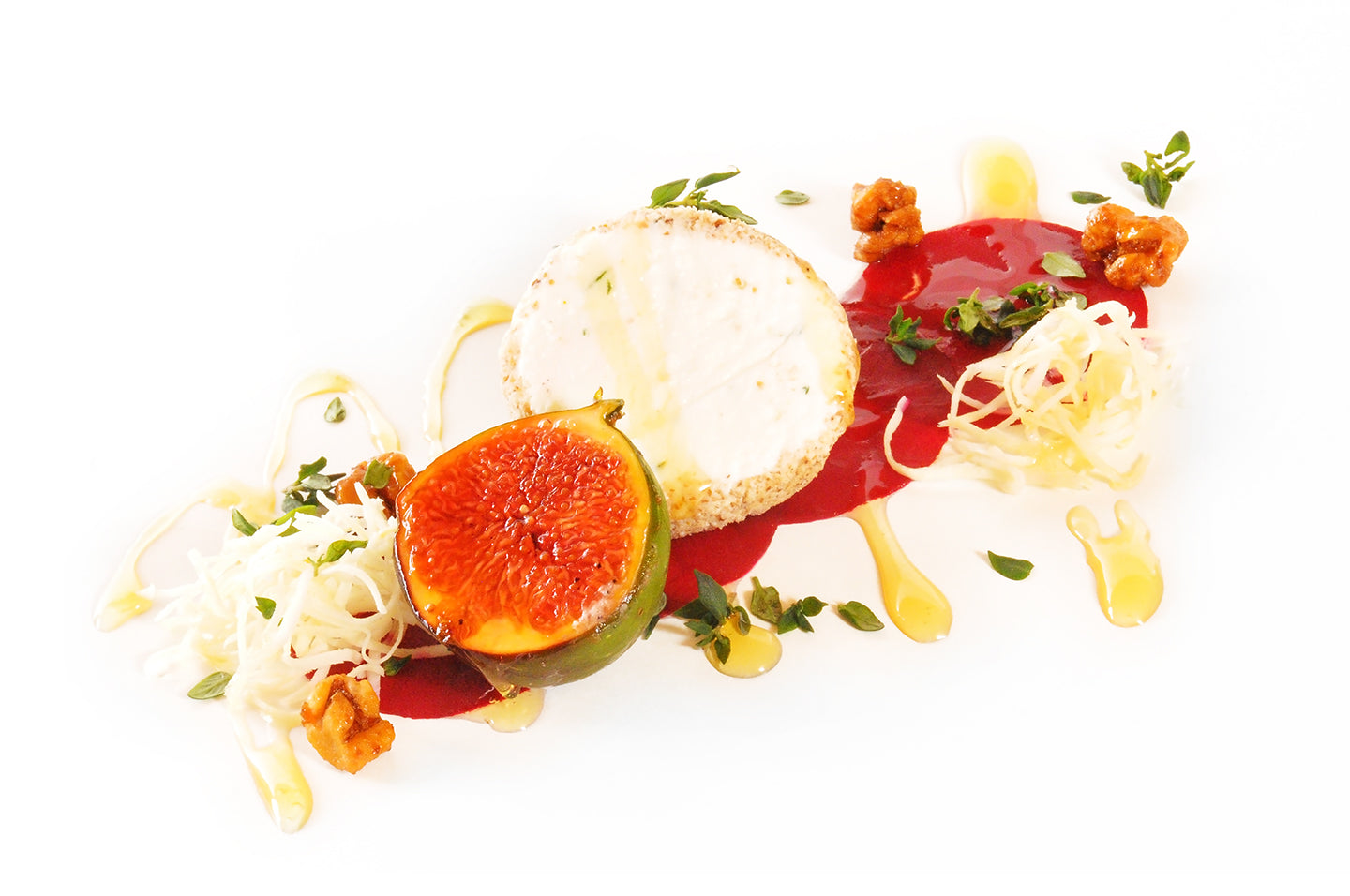 Zum Schluss die Feigen, die Rande und die Frischkäsebällchen mit dem geriebenen Meerrettich, den karamelisierten Baumnusskernen, den Thymianblättern und dem Honig anrichten und mit wenig Fleur de Sel garnieren.