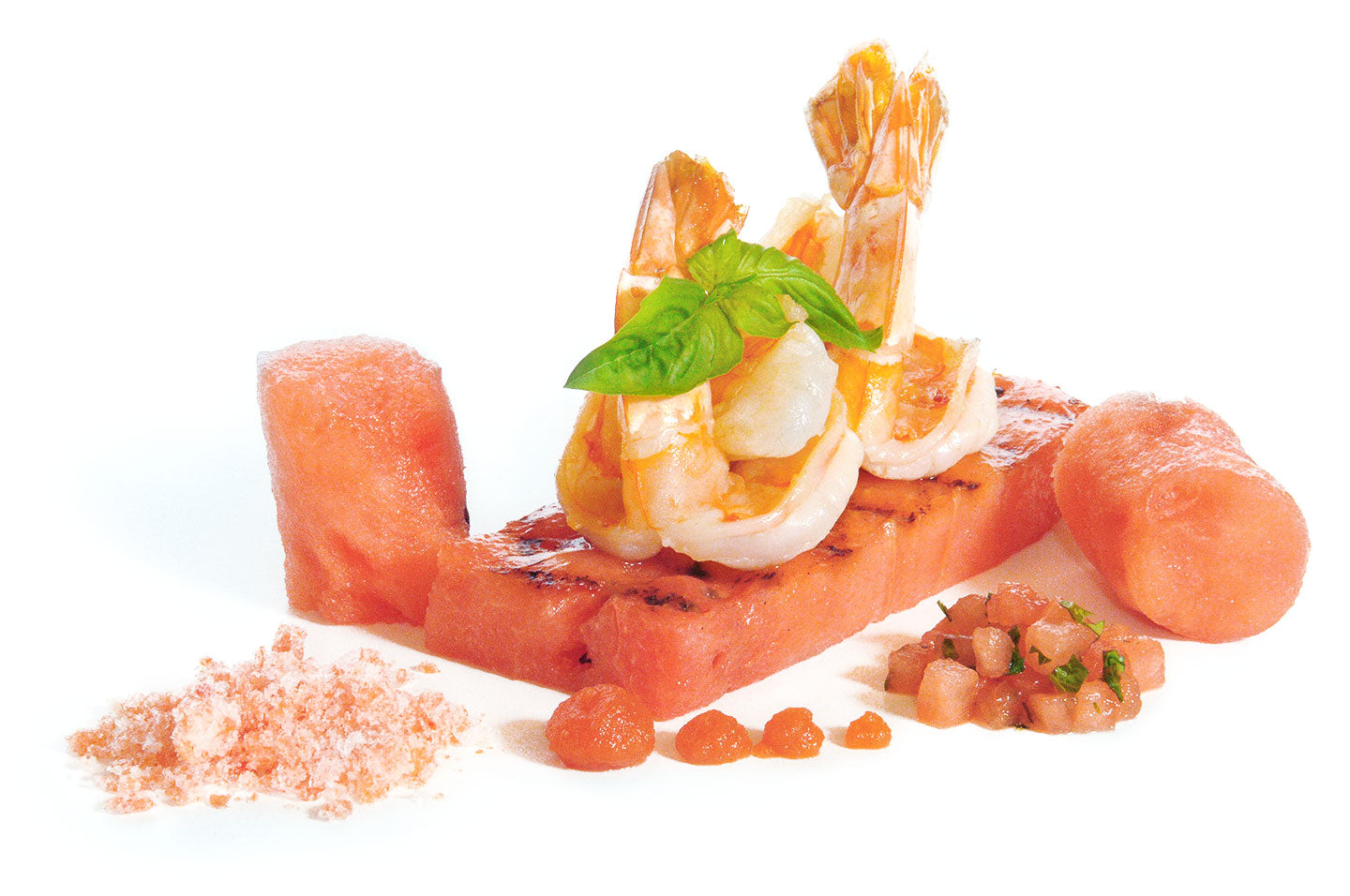 Grillierte Wassermelonenscheibe auf dem Teller anrichten. Die Scampischwänze, welche mit etwas Olivenöl und Kräutern mariniert wurden, direkt am Tisch grillieren.